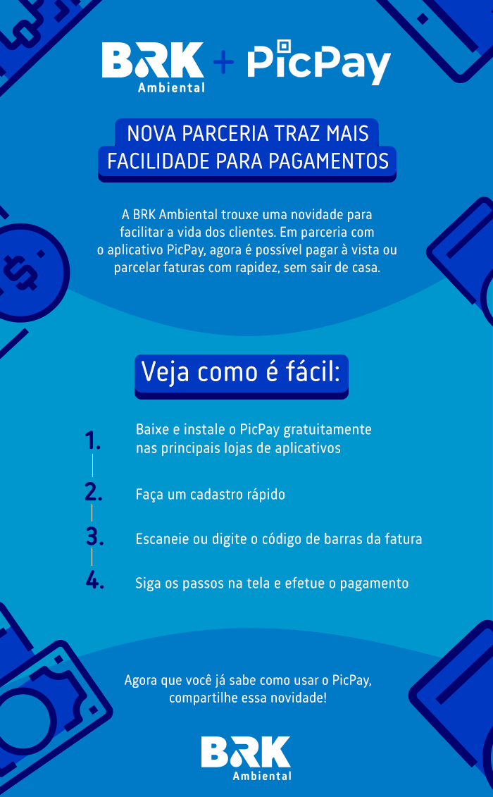 Caso o pagamento seja aprovado imediatamente, o comprovante fica disponível no aplicativo. Em situações em que for necessária a análise de segurança do cartão de crédito, o cliente deverá aguardar o e-mail e/ou notificação do PicPay. Além desta plataforma, os clientes da BRK Ambiental também podem optar pelo serviço de internet banking ou o débito automático para pagar as faturas.